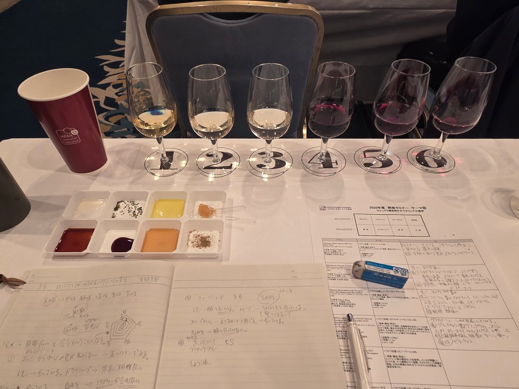 今日は「ロジックで解き明かすペアリングの美学」という題の例会で、食材(白ワイン用、赤ワイン用)が出されて、五味(甘味、酸味、塩味、苦味、旨味)やテクスチャー、フレイバーを考えながらのテイスティングとなりました!!いちよ、ノートにいろいろと書きこしました。食材によって相性が悪くワインの味が消されてしまう場合があったり、逆に相性が良く味が際立ってくる場合を学びました。詳しく書き出すと切りがありませんのでいちいち書けませんが、奥が深くソムリエならそこまで考えれないといけないのだなあと感じました!ペアリングと言っても世界には数えきれないほどの料理があるわけだし、ワインも世界でどれほどのワイン数があるのか?!把握するのも困難。とにかく、自分の力を年々つけていけば良いと思った。次回は家でチリワインのズームアップセミナーです。次は日本代表岩田渉さんが講師です!チリワインも興味あるので楽しみです。今日は以上です。